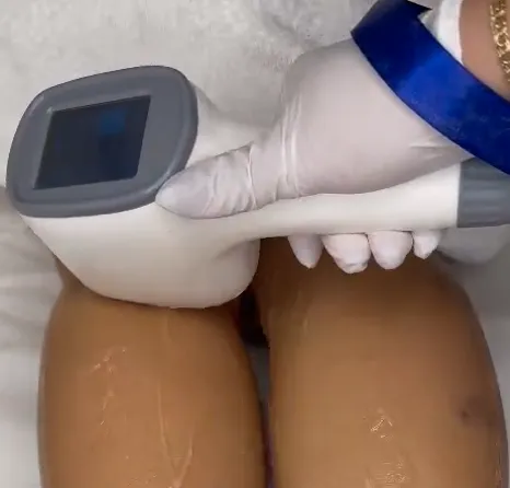 Ultraljudsgel appliceras, vilket medför optimal överföring från apparaten till det behandlade området. Därefter placeras apparaten på huden och dess styrka justeras utifrån hudtyp och område.